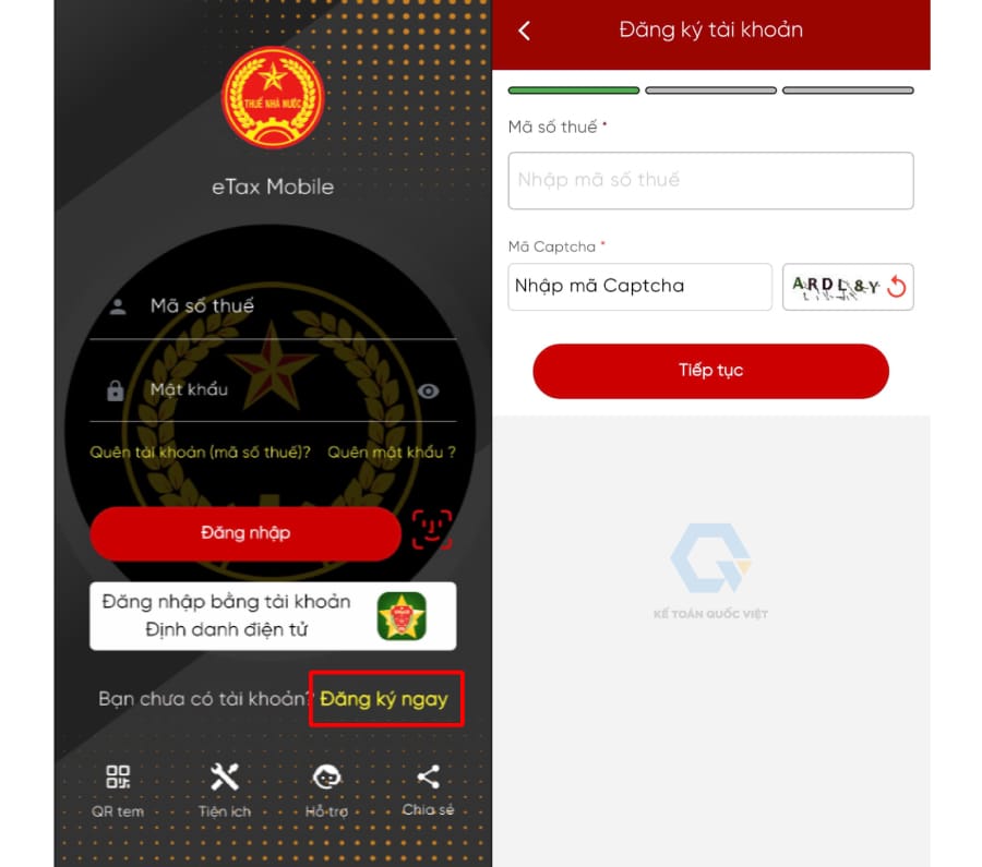 Bước 1: Mở ứng dụng eTax Mobile ➨ chọn “Đăng ký ngay” ➨ nhập chính xác mã số thuế cá nhân & mã captcha ➨bấm chọn “Tiếp tục”.