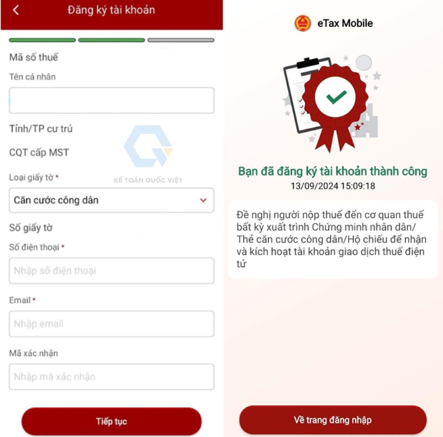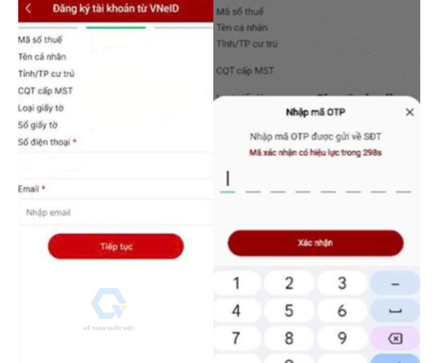 - Tại giao diện “Đăng ký tài khoản từ VNeID”, hệ thống sẽ tự động cập nhật thông tin đăng ký thuế của bạn, bạn bấm chọn “Tiếp tục”, nhập mã OTP và bấm chọn “Xác nhận” để hoàn tất.