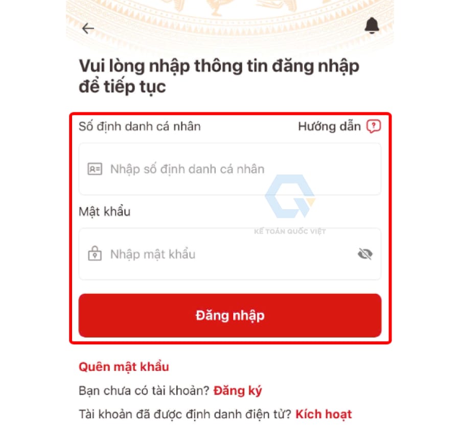 Bước 2: Hệ thống tự động chuyển sang giao diện của ứng dụng VNeID ➨ bạn nhập số định danh cá nhân, mật khẩu ➨ chọn “Đăng nhập”.