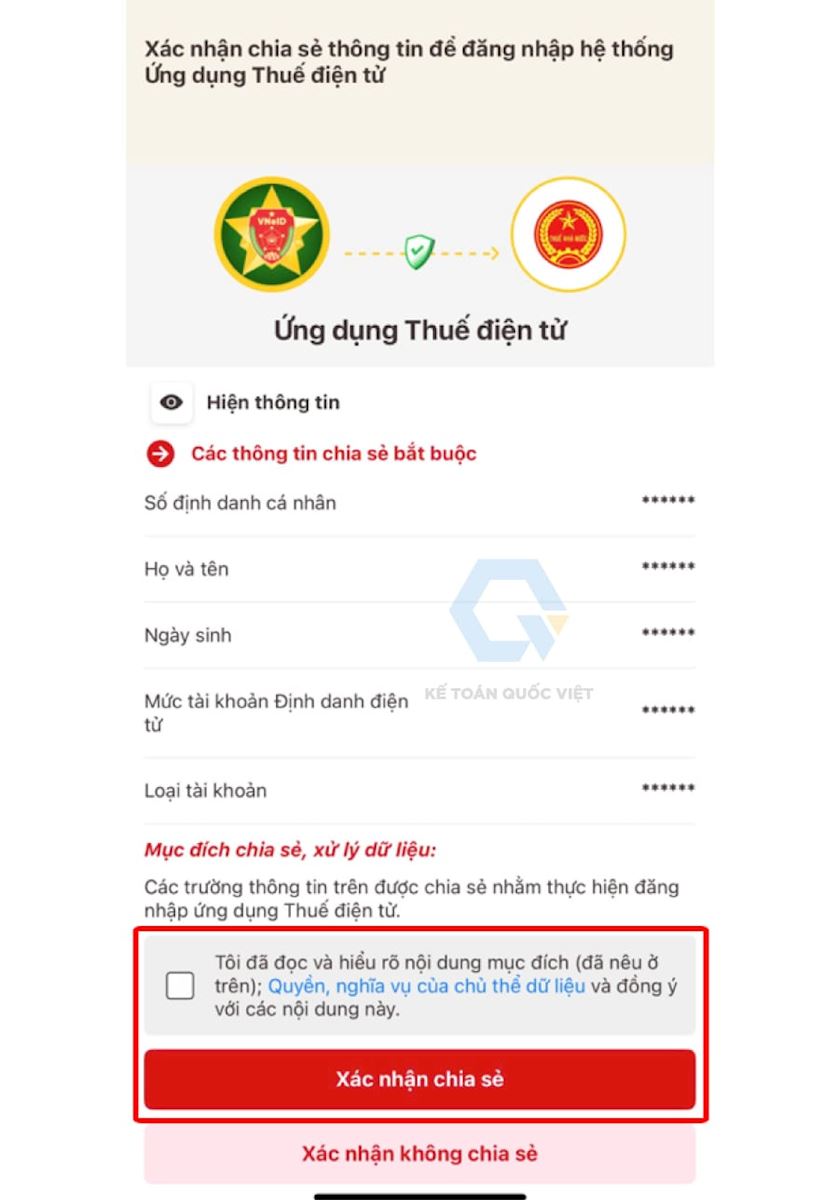 - Tích chọn ô “Tôi đã đọc và hiểu rõ nội dung mục đích….” và chọn “Xác nhận chia sẻ”.