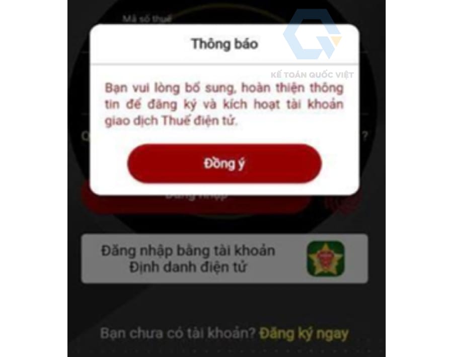 - Hệ thống sẽ hiển thị thông báo yêu cầu đăng ký tài khoản thuế điện tử ➨ bạn bấm chọn “Đồng ý”. Tại đây, bạn thực hiện đăng ký tài khoản thuế điện tử từ VNeID;