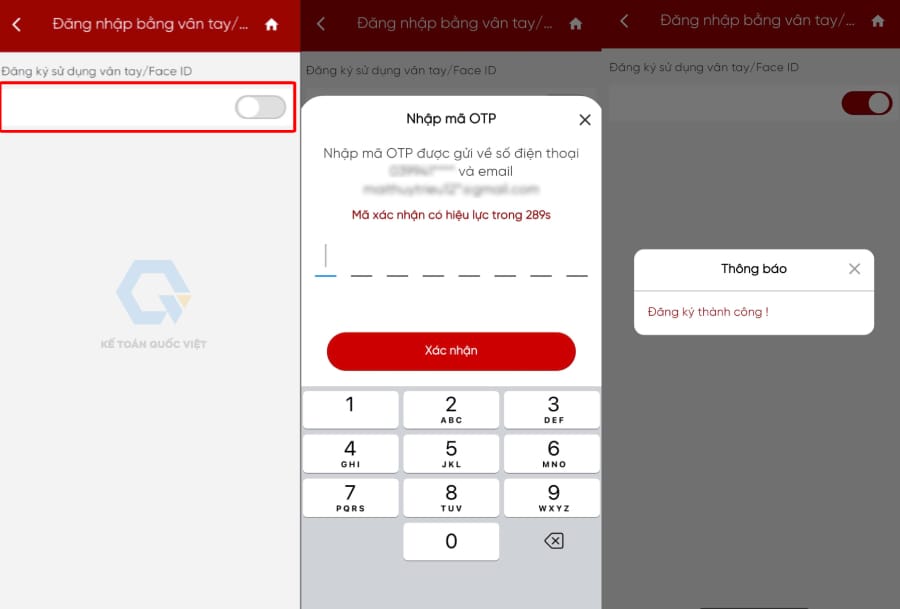 Kết quả: Hệ thống thông báo đăng ký thành công và nút bật của mục “Đăng ký sử dụng vân tay/FaceID” sẽ chuyển sang màu đỏ.