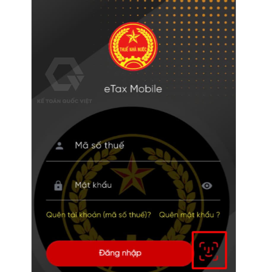 Bước 3: Đăng nhập vào eTax Mobile bằng sinh trắc học ➨ bạn chọn biểu tượng FaceID tại giao diện đăng nhập app eTax Mobile để tiến hành đăng nhập bằng vân tay hoặc face ID.