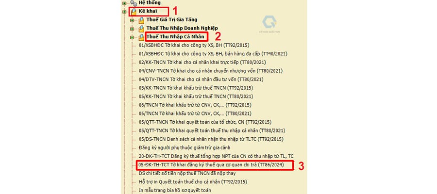 - Tiếp theo chọn mẫu “05-ĐK-TH-TCT Tờ khai đăng ký thuế qua cơ quan chi trả (TT86/2024)”.