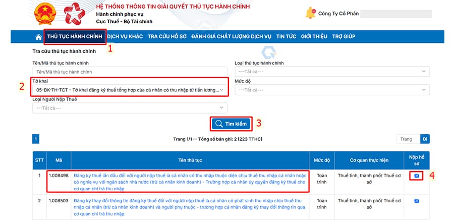 - Trường hợp nộp hồ sơ đăng ký mã số thuế lần đầu, doanh nghiệp chọn biểu tượng nộp hồ sơ của mã thủ tục 1.008498 - “Đăng ký thuế lần đầu đối với người nộp thuế là cá nhân có thu nhập thuộc diện chịu thuế thu nhập cá nhân hoặc có nghĩa vụ với ngân sách nhà nước (trừ cá nhân kinh doanh) - Trường hợp cá nhân ủy quyền đăng ký thuế cho cơ quan chi trả thu nhập”.