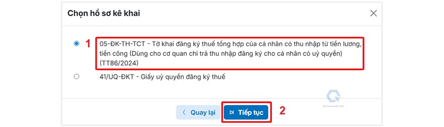 - Tại mục tờ khai chọn tờ khai 05-ĐK-TH-TCT - Tờ khai đăng ký thuế tổng hợp của cá nhân có thu nhập từ tiền lương, tiền công (Dùng cho cơ quan chi trả thu nhập đăng ký cho cá nhân có ủy quyền) (TT86/2024);