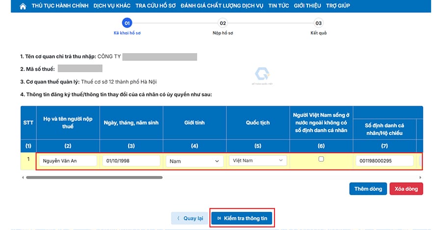 Sau khi điền đủ các thông tin của người lao động, doanh nghiệp chọn “Kiểm tra thông tin” để hệ thống thuế kiểm tra lại một lượt các thông tin của người nộp thuế qua hồ sơ lưu tạm.