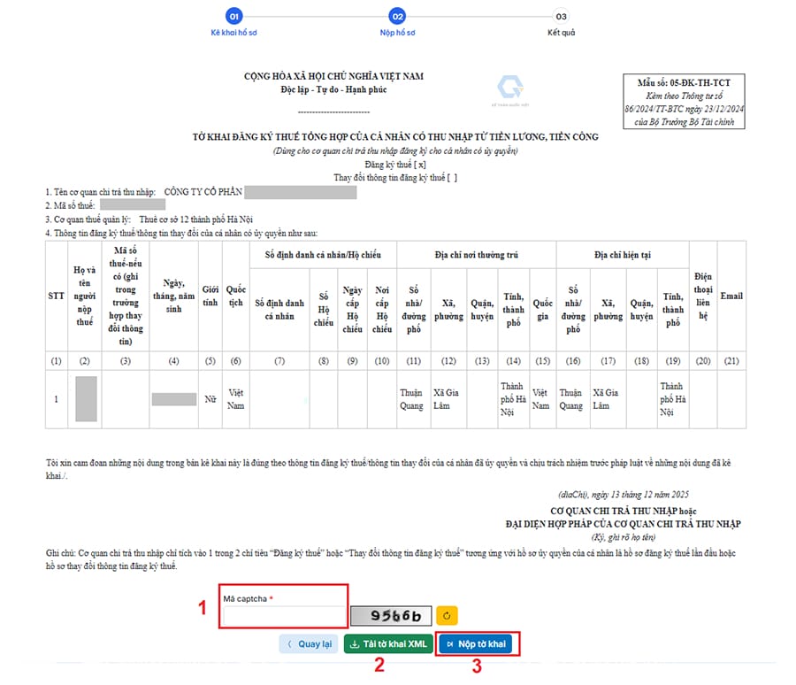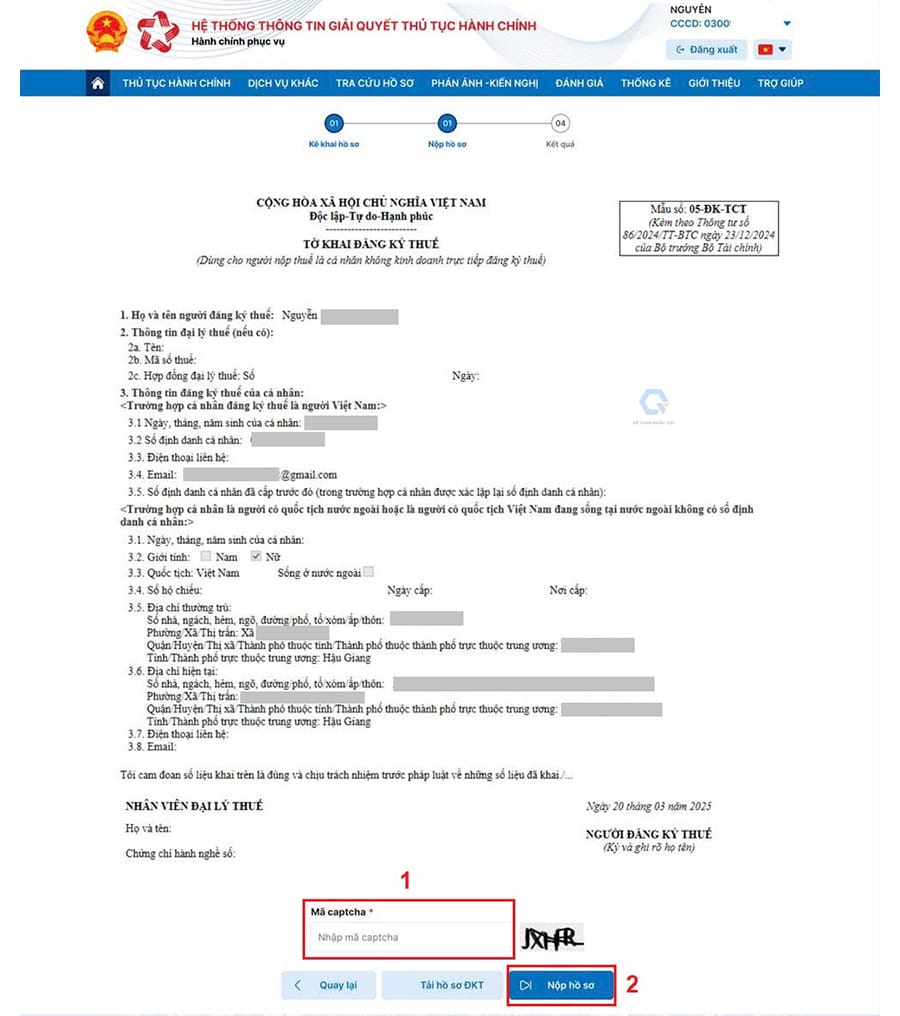 Bước 5: Kiểm tra thông tin tờ khai 05-ĐK-TCT và nộp hồ sơ