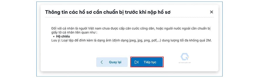 - Hệ thống hiển thị thông báo các hồ sơ cần chuẩn bị ➨ bạn chọn “Tiếp tục”;