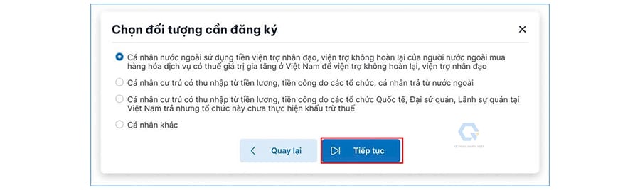 - Tiếp theo, chọn đối tượng tương ứng với trường hợp của cá nhân ➨ chọn “Tiếp tục”;