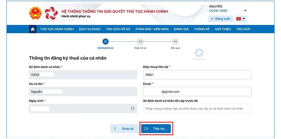- Tại ô “Mã số thuế”: Điền thông tin số CCCD;
