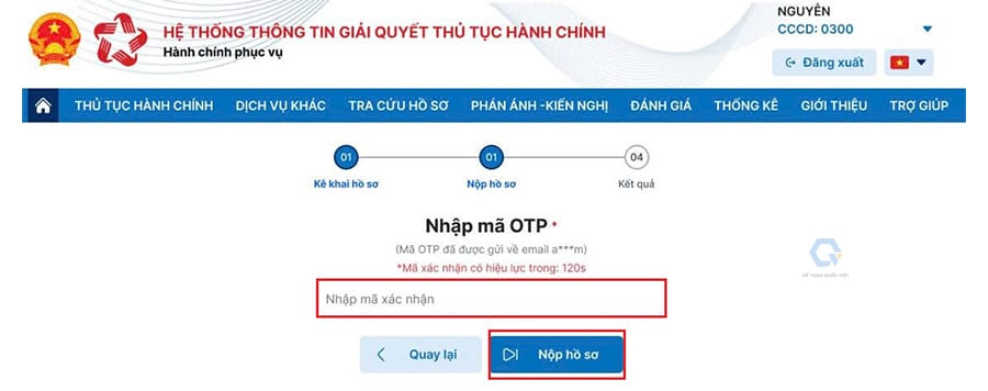 Bước 6: Nhập mã OTP để xác nhận nộp hồ sơ