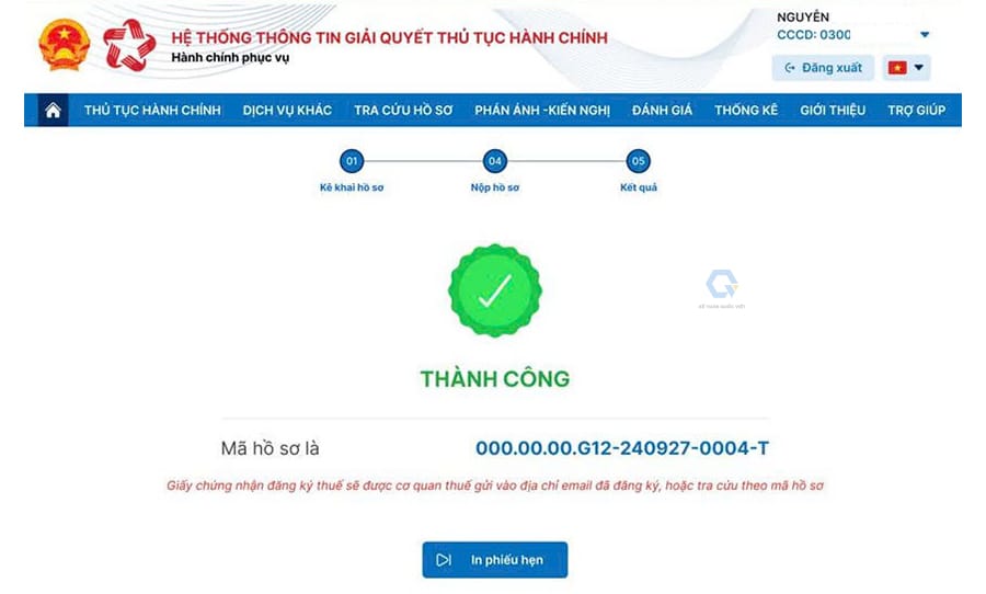 - Hệ thống hiển thị màn hình nộp hồ sơ thành công như bên dưới. Bạn lưu lại mã hồ sơ để sau này tra cứu kết quả hồ sơ đã nộp.