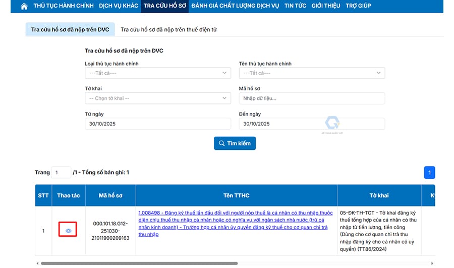 Bước 2: Tra cứu hồ sơ đăng ký mã số thuế cá nhân đã nộp