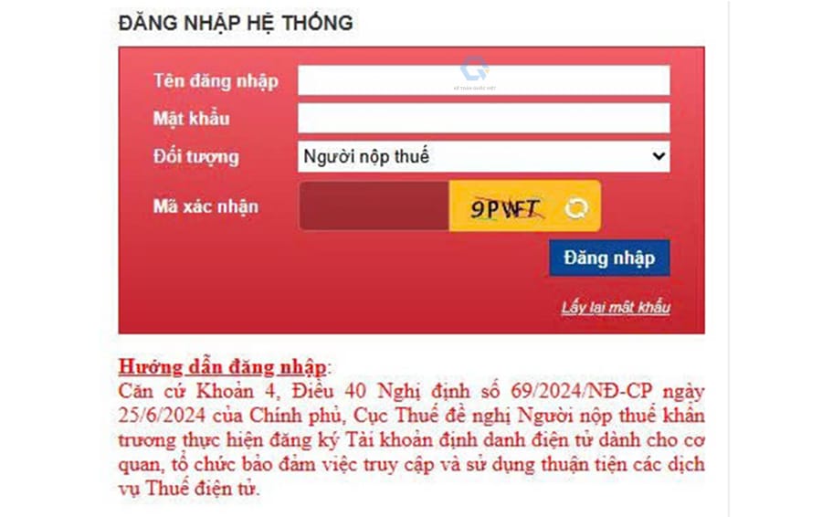 - Nhập “mã số thuế và mật khẩu” của doanh nghiệp ➨ tiếp theo nhập mã Captcha (mã xác nhận) để hoàn thành quá trình đăng nhập;