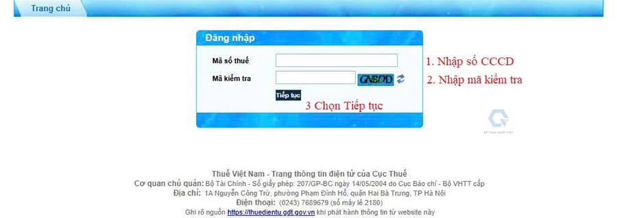 - Tại ô “Mã số thuế”, nhập số CCCD của chủ hộ ➜ nhập mã kiểm tra ➜ chọn “Tiếp tục”;