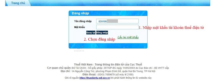 - Nhập mật khẩu tài khoản thuế do cơ quan thuế quản lý cấp ➜ chọn “Đăng nhập”.