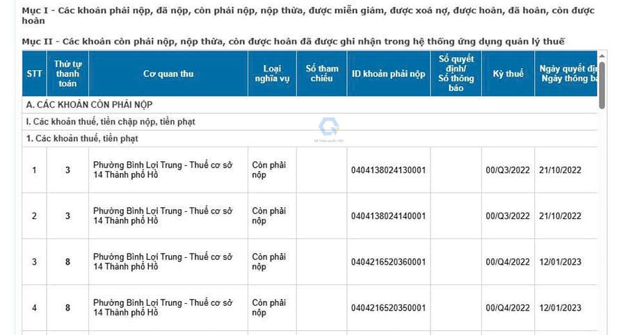 - Nếu tại cột “Loại nghĩa vụ” hiển thị “Còn phải nộp” thì hộ kinh doanh cần thực hiện lập giấy nộp tiền để hoàn tất nghĩa vụ thuế.