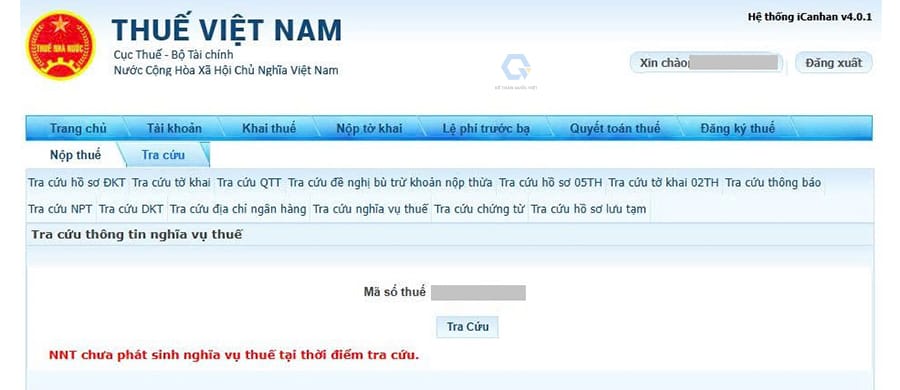 - Nếu hộ kinh doanh không nợ thuế, hệ thống sẽ hiển thị thông báo: “NNT chưa phát sinh nghĩa vụ thuế tại thời điểm tra cứu”.