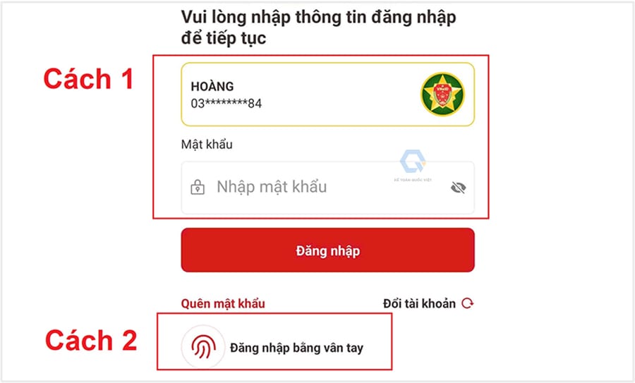 - Cách 2: Đăng nhập bằng sinh trắc học vân tay (nếu đã cài đặt tính năng này).