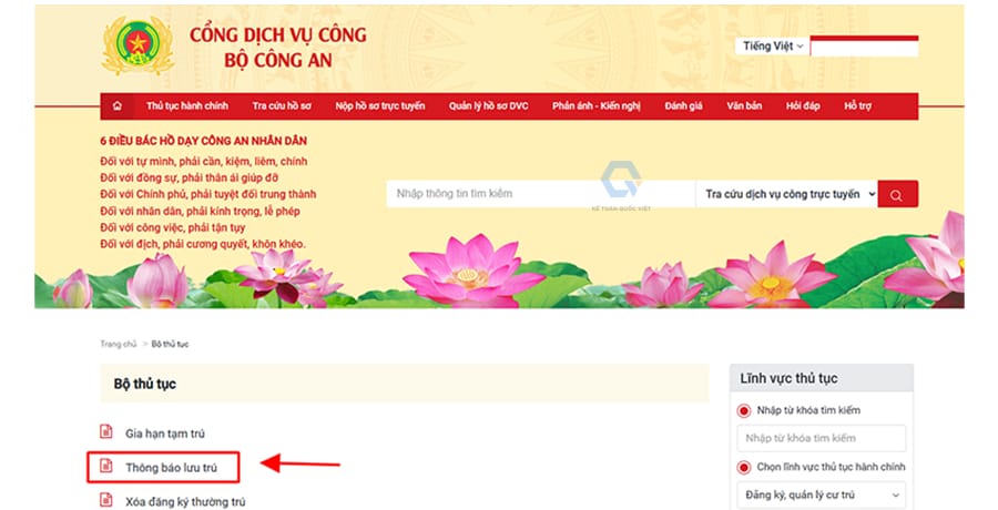 Bước 2: Chọn mục “Lĩnh vực đăng ký, quản lý cư trú”