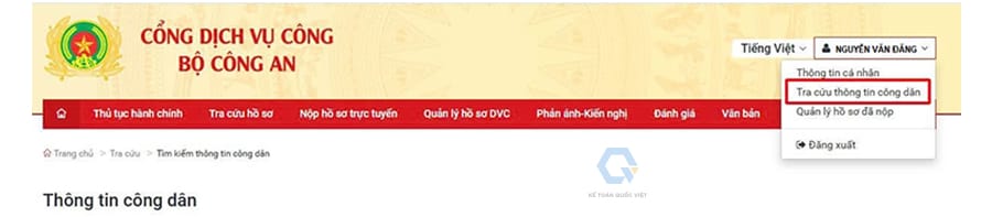 - Nhấn vào ô họ tên của bạn ở góc trên cùng bên phải màn hình ➞ chọn mục “Tra cứu thông tin công dân”;