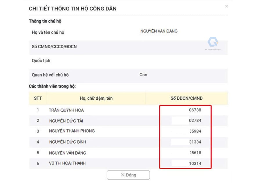 - Hệ thống sẽ hiển thị thông tin các thành viên hộ gia đình (bao gồm cả bạn) và mã số định danh cá nhân của từng người.
