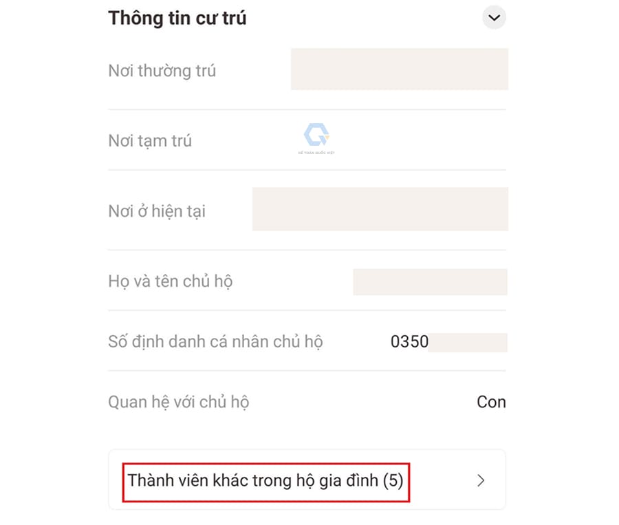- Để xem thông tin và mã định danh của các thành viên khác trong hộ gia đình, bạn chọn “Thành viên khác trong hộ gia đình”.