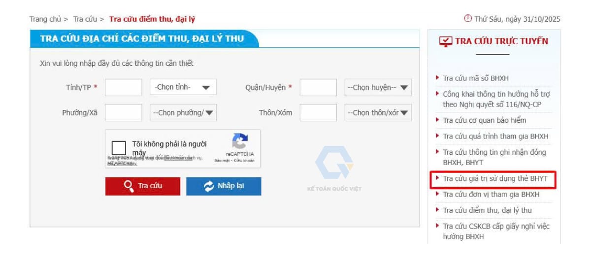 ➧ Bước 2: Chọn nút tiện ích “Tra cứu trực tuyến” và tiếp tục chọn “Tra cứu giá trị sử dụng thẻ BHYT”