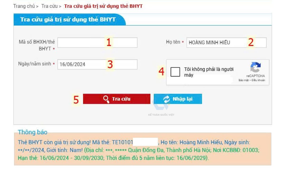 - Họ và tên: Nhập chính xác họ và tên của trẻ cần tra cứu mã số BHYT;