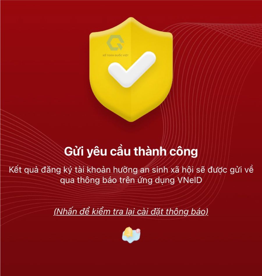 Sau khi tiếp nhận thông tin đăng ký tài khoản hưởng an sinh xã hội, hệ thống sẽ thông báo “Gửi yêu cầu thành công”. Bạn chờ hệ thống xử lý và nhận kết quả thông qua ứng dụng VNeID.